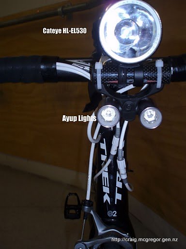 My replacement Ayup headlamp mounts had not arrived from Australia before I left Wellington (In hindsight they had arrived just seven minutes after I left!). Thankfully my work colleague Phil was able to loan me a mount to use, which I fitted when he arrived at the cabin next door. I matched the Ayup light with a Cateye HL-EL530 headlamp to meet the dual lighting requirements for Audax rides. It also gave me a combination of a rechargable system with long battery life, and an backup system that could run off off-the-shelf batteries. Both have a good run times and are bright enough to be used alone for night-time road riding. The EL530 has a small concentrated bright spot, with plenty of less lit, but acceptably right area around it.to see all you need. The Ayup lights are smaller, yet brighter and offering a far broader and consistent coverage area. The Ayup system offers better lighting, but the EL530 runs on four easily purchasable AA batteries.